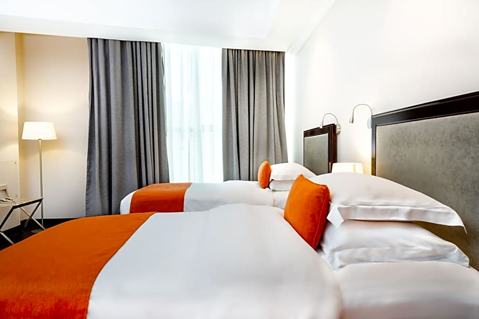 Our Deluxe Twin Room offers spacious 33sqm equipped with two single beds and crisp linens, a workspace, complimentary high-speed and wireless internet, in-room coffee and tea making facilities and mini fridge, with city view. Amenities: Access to 24-hour fitness center, LCD TV, in-room safe, complimentary coffee/ tea and bottled water, iron and iron board, airport transfers at minimal fee.